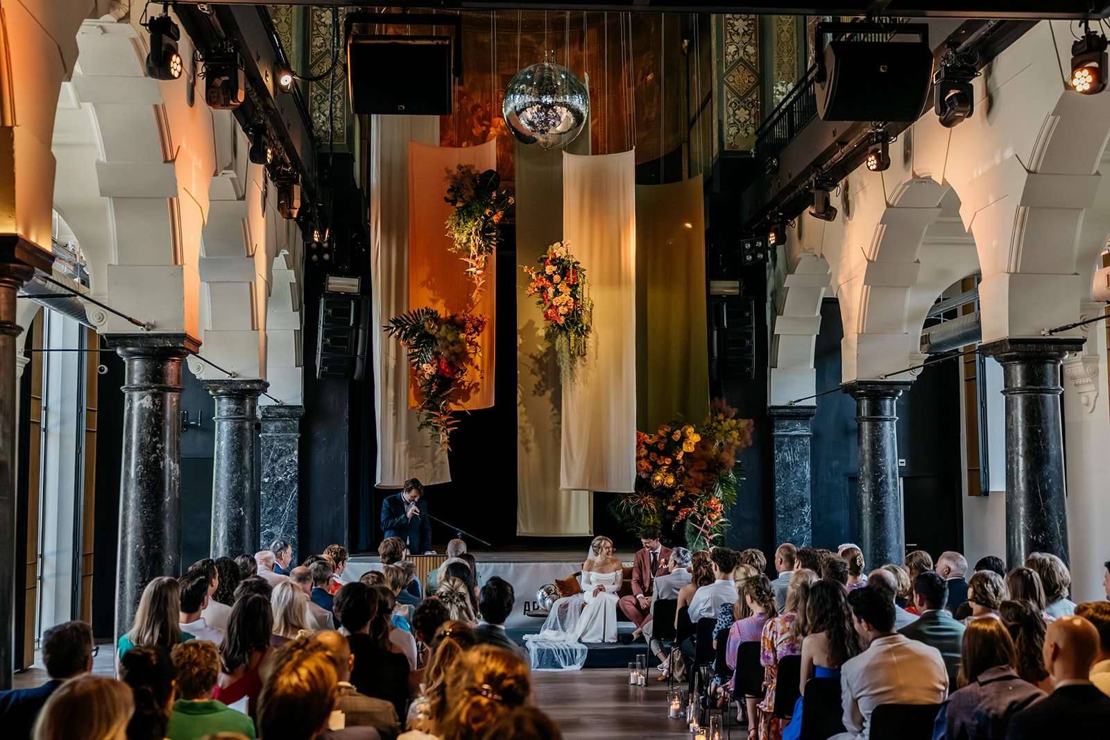 Sommige bruiloften hebben meteen een eigen energie. Op 12 juli 2025 mochten we bij Hotel Arena in Amsterdam de bloemen verzorgen voor Jessica & Marc — een dag met een zonnige, mediterrane sfeer, met discoballen en hun favoriete kleuren als rode draad. Met warme tinten, zachte perzik en koraal, een vleug rood, fris groen en hier en daar zilveren details. Het idee was helder: kleur, liefde, vrolijkheid en feest. Niet stijf. Wel stijlvol.